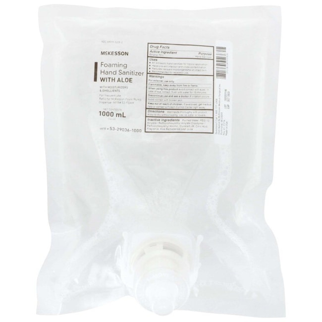 Hand Sanitizer with Aloe McKesson 1,000 mL Ethyl Alcohol Foaming Dispenser Refill Bag Refill for McKesson Pump Foam Dispenser (MFR # 53-FOAM) and McKesson Automatic Foam Dispenser (MFR # 53-FOAM-AUTO) Contains Vitamin E, moisturizers and emollients to help prevent drying of the skin with frequent use A no-rinse, moisturizing hand gel helps decrease bacteria on skin Helps protect against cross contamination Convenient and ready to use; no water or towels needed Made with aloe to help keep skin soft