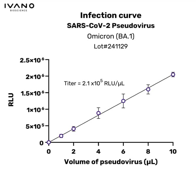 IVANO BIOSCIENCE Validated SARS-CoV-2 pseudovirus, Omicron BA.1 variant, 100 µL of pseudovirus enables 50 reactions in a 96-well plate.