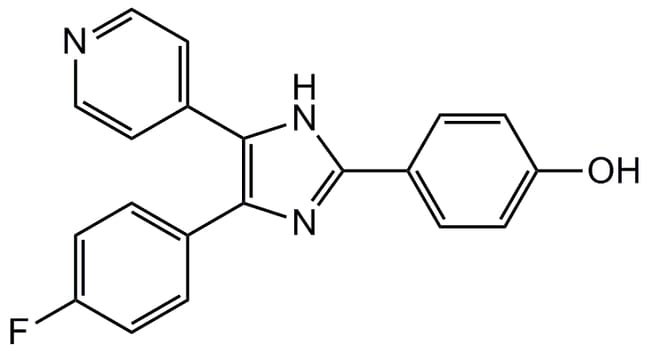SB202190 (1 mg), Adipogen Life Sciences. Chemical. CAS: 152121-30-7. Formula: C20H14FN3O. MW: 331.3. Potent and cell permeable p38 MAP kinase inhibitor. Apoptosis inducer. Inhibits p38alpha and beta, but not gamma and delta isoforms. Does not inhibit ERK2 or other members of the MAP kinase family or their upstream activators. JNK activator. Autophagic vacuole inducer