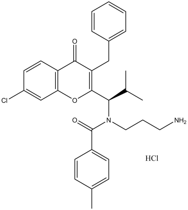 SB743921 (CAS 940929-33-9) is a potent and selective inhibitor of kinesin spindle protein (KSP) exhibiting a Ki of 0 1 nM for human KSP and 0 12 nM for mouse KSP with negligible affinity for other kinesins By targeting KSP SB743921 disrupts mitotic spindle formation leading to cell cycle arrest and apoptosis In cellular assays SB743921 demonstrates strong antiproliferative activity against SKOV3 Colo205 MV522 and MX1 cell lines with IC50 values ranging from 0 02 to 1 7 nM Additionally it shows efficacy in multiple human tumor xenograft models and in a murine P388 lymphocytic leukemia model SB743921 is utilized in oncology research for mechanistic studies and therapeutic evaluation of mitotic inhibition
