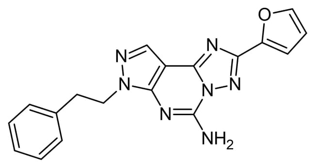 MW 345.4 Da, Purity >99%. Potent, highly selective A2A receptor antagonist. (Ki values are 1-2, 289 and >10000 nM at A2A, A1 and A3 receptors, respectively). Displays therapeutic effects in animal Parkinson's models and elicits locomotor sensitization *in vivo*.