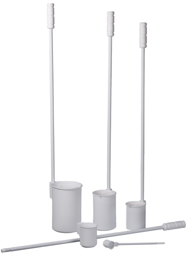 All parts coming into contact with the sample medium are made of pure white PTFE. Completely inert against all substances (with the exception of elementary fluoride). The rod is stabilized with a steel core which is completely encapsulated in PTFE. The scoop PTFE with 10 ml (0.34 oz.) has a strong rod with a length of 155 mm (6.10 in.).