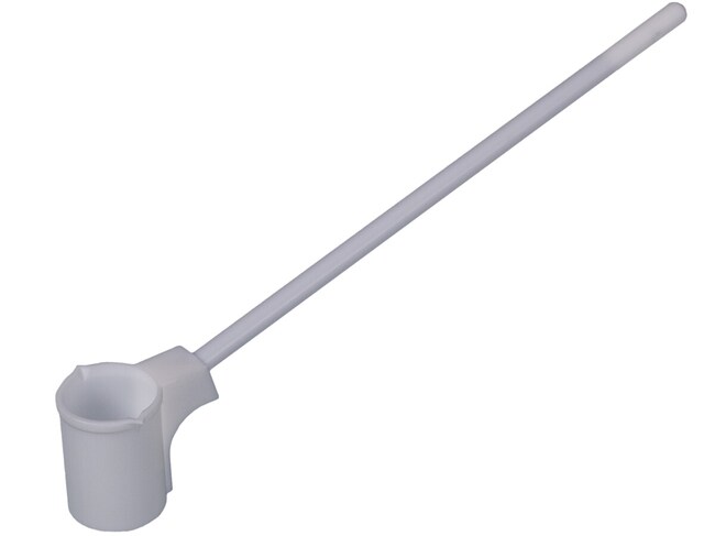 All parts coming into contact with the sample medium are made of pure white PTFE. Completely inert against all substances (with the exception of elementary fluoride). The rod is stabilized with a steel core which is completely encapsulated in PTFE. The scoop PTFE with 10 ml (0.34 oz.) has a strong rod with a length of 155 mm (6.10 in.).