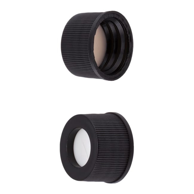 Caps, Screw Top, with Silicone Rubber / PTFE Pre-Slit Septa, bonded in knurled, polypropylene, Black Caps. For use with 13-425mm thread, 15x45mm autosampler vials. MicroSolv Brand. 100/PK.