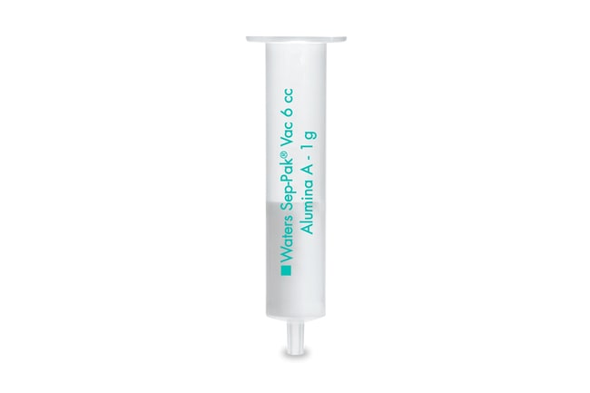 Sep-Pak Alumina A Vac cartridges contain a highly active grade of alumina with an acidic surface chemistry. The aluminum oxide surface provides an extremely polar surface for analyte retention and has properties of a Lewis acid. This normal phase sorbent is similar in use to silica; however, it is slightly more stable than unfunctionalized silica under high pH conditions. This acidic alumina is also low-capacity ion exchanger in aqueous media. Unlike polymer-based ion exhangers, this sorbent is unaffected by high-energy radioactivity and can be used for radioactive compound isolation. These syringe-barrel-type cartridges are designed for use with vacuum manifolds and automated SPE instruments.