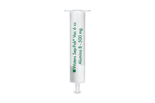 Sep-Pak Alumina B Vac cartridges contain a highly active grade of alumina with a basic surface chemistry. The aluminum oxide surface provides an extremely polar surface for analyte retention and has properties of a Lewis acid. This normal phase sorbent is similar in use to silica; however, it is slightly more stable than unfunctionalized silica under high pH conditions. This basic alumina is also low-capacity ion exchanger in aqueous media. Sep-Pak Alumina B Vac cartridges can be used to extract phospholipids, steroids, and catecholamines. Since Sep-Pak Alumina B is unaffected by high-energy radioactivity, these cartridges can be used for radioactive compound isolation. These syringe-barrel-type cartridges are designed for use with vacuum manifolds and automated SPE instruments.