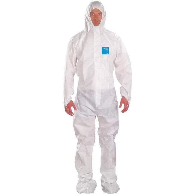 Disposable & Chemical Resistant Coveralls; Garment Style: Coveralls ; Size: 5X-Large ; Material: SMS ; Closure Type: 2-Way Zipper with Storm Flap; Finger Loops; Elastic ; Cuff Style: Elastic with Thumb-loop ; Ankle Style: Attached Anti-Skid Boots; Elastic