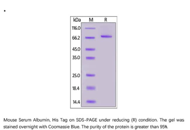 Recombinant Protein;1MG;Mouse Serum Albumin, His Tag (MSA-M52H8) is expressed from human 293 cells (HEK293). It contains AA Glu 25 - Ala 608 (Accession # P07724-1).;This protein carries a polyhistidine tag at the C-terminus. The protein has a calculated MW of 67.8 kDa. The protein migrates as 65-75 kDa under reducing (R) condition (SDS-PAGE) due to glycosylation.