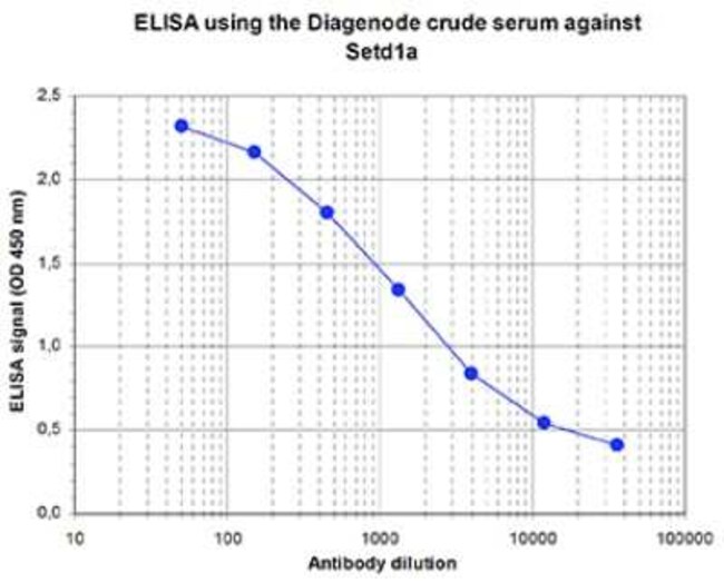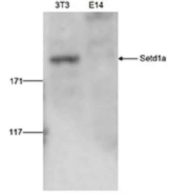 | Immunogen | Polyclonal antibody raised in rabbit against mouse SETD1A (Set domain containing 1A), using three KLH-conjugated synthetic peptides: two containing an amino acid sequence from the N-terminal part of the protein and one containing an amino acid sequence from the central part of the protein (1). |