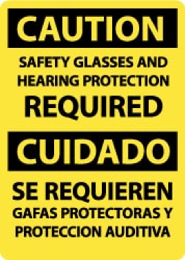 Sign: Rectangle, "Caution - Safety Glasses and Hearing Protection Required"