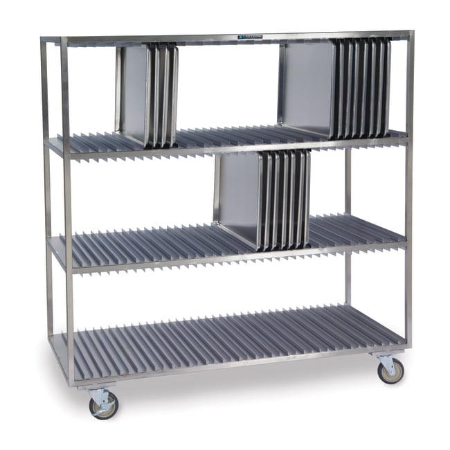 Conveniently store domes and trays in these open racks for efficient drying. The Lakeside 848 Mobile Sheet Pan Drying Rack, with channel slides, fits 14 x 18-in. or 18 x 26-in. pans, and has a 120 pan capacity. 11- gauge all welded stainless steel base ensures superior strength and balance. This unit has a 14-gauge stainless steel frame and “L” supports increase stability to prevent accidents and spills. Rugged all-welded frame of stainless steel square tubing. Accommodates 18" x 26" and 14" x 18" pans or trays. 5" (127) corner stem no-mark polyurethane casters offer flexibility to move rack from sink to storage area. Stainless steel channel slides with 1½" spacing. Solid stainless steel tray shelves. The pan-stop ledge prevents pans from sliding off of back side. Superior lead times. Made in the USA.