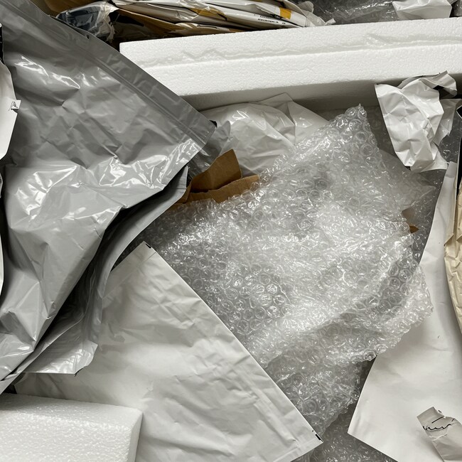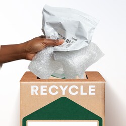 - Use this Zero Waste Box to recycle any empty plastic shipping material used for packing and transport materials including: Bubble Wrap, Deflated Air Cushions, Plastic Tape Dispensers, Siliconized Paper Label Backing, Packing Foam, Siliconized Pet Label Backing, Stretch Wrap. Does not accept Cardboard, Shipping Peanuts, Paper Based Padded Bubble Mailers, heavily contaminated, biodegradable, or hazardous materials.