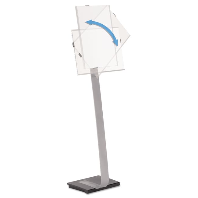 Patented mechanism allows effortless rotation from portrait to landscape orientation Anti-glare crystal clear front panel removes in seconds for quick insertion of sheets High-quality aluminum floor stand has a rugged cast iron base with rubber pads for stability Can also be used with DURABLE Literature Dispensers (sold separately) Frame Color Clear Size 15 x 50 Insert Size 11 x 17 Material(s) Acrylic Alumnium Cast Iron Base