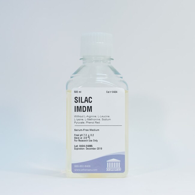 SILAC media is prepared specifically for labeling experiments involving the use of stable amino acid isotopes. Athena provides several of the most commonly used media without L-arginine, L-lysine, L-leucine and L-methionine, the four mostly commonly used heavy isotope labeled amino acids.