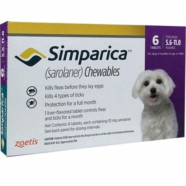 Simparica (sarolaner) kills adult fleas, and is indicated for the treatment and prevention of flea infestations (Ctenocephalides felis), and the treatment and control of tick infestations [Amblyomma americanum (Lone Star tick), Amblyomma maculatum (Gulf Coast tick), Dermacentor variabilis (American dog tick), Ixodes scapularis (black-legged tick), and Rhipicephalus sanguineus (brown dog tick)] for one month in dogs 6 months of age or older and weighing 2.8 pounds or greater. See package insert for complete product details.