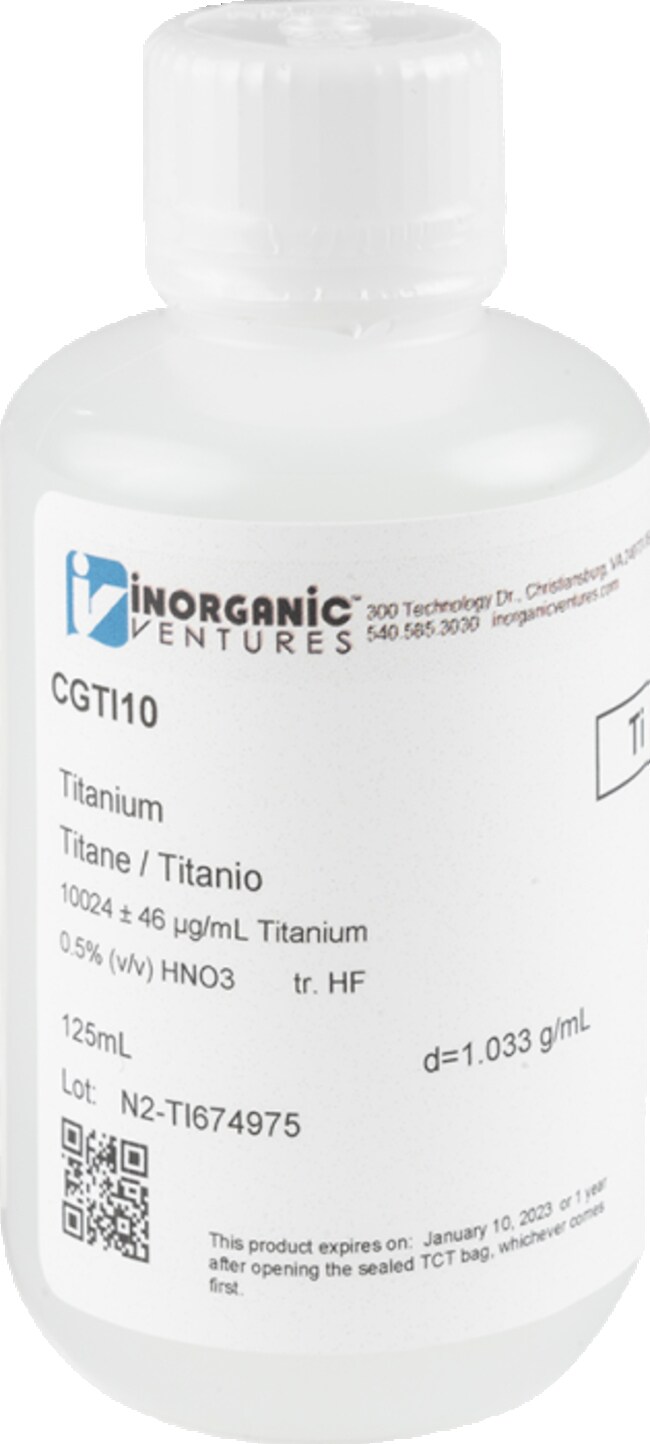 Inorganic Ventures' 10,000 ppm (µg/mL) Titanium for ICP is a 125mL certified reference material set in a nitric acid /hydrofluoric acid matrix for stability. This titanium standard is Traceable to NIST and manufactured in accordance with our stringent Quality Assurance guidelines. See Certificate of Analysis for expiration.
