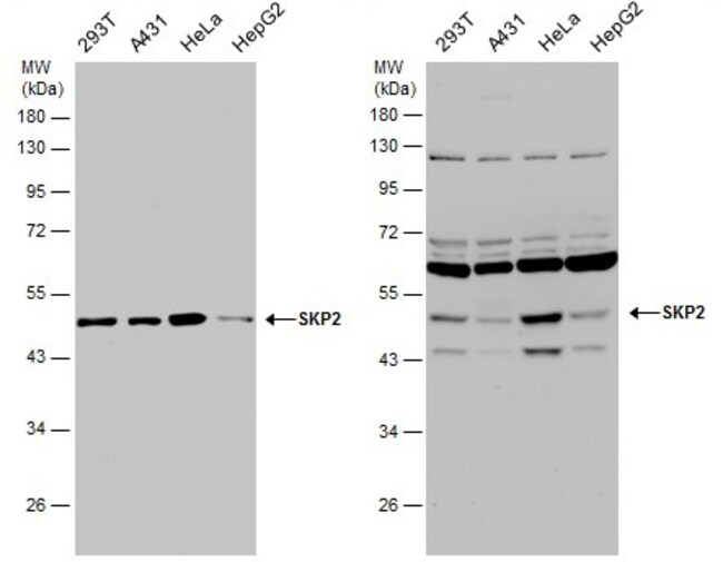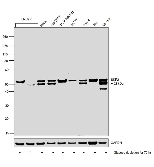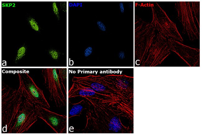 Skp2 (S-phase Kinase-associated Protein 2) belongs to the family of F-box proteins that interact with the Cyclin A-Cdk2 complex. Skp2 is essential for the G1-S transition in both transformed cells and diploid fibroblasts. Biochemical and genetic experiments have demonstrated that Skp2 is required for the ubiquitination and consequent degradation of p27 in cultured mammalian cells and in vitro reconstitution assays. In normal tissues, Skp2 is expressed in tonsil and placenta. In tumor tissues, Skp2 is expressed widely, in some colon, prostate, pancreas, and skin cancers, with high expression in lung, breast, ovarian, and endometrial cancers. Research suggests that Skp2 plays a role in oncogenesis, particularly in the pathogenesis of lymphomas and breast cancers.