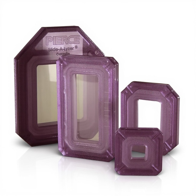 Slide-A-Lyzer Dialysis Cassettes (20K MWCO) facilitate the simple and effective removal of buffer salts and small contaminants from proteins and other macromolecules larger than 20,000 Daltons. They are available in four sizes to accommodate sample volumes between 0.5 and 30 mL. These devices are easier to use than traditional dialysis tubing, providing faster buffer exchange and more complete sample recovery. Slide-A-Lyzer cassettes can be used for a wide range of applications including low-molecular weight contaminant removal, buffer exchange, desalting, equilibrium dialysis, and sample concentration. Liquid samples are easily added and removed by penetrating the self-sealing gasket with a hypodermic needle attached to a syringe. No knots, clips, or caps are needed to seal the units and prevent leaking and sample-loss during the dialysis procedure.