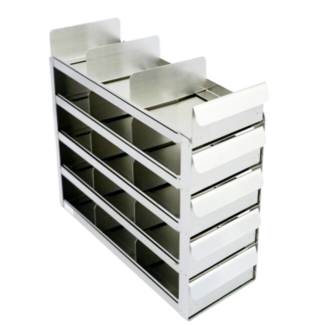 Ideal freezer racks feature slide out trays that maximize storage space in upright freezers or refrigerators. Constructed of corrosion resistant stainless steel for rugged durability. Racks will accommodate all 5" square x 2" high cardboard or plastic boxes. Racks are available in several convenient sizes and capacities.