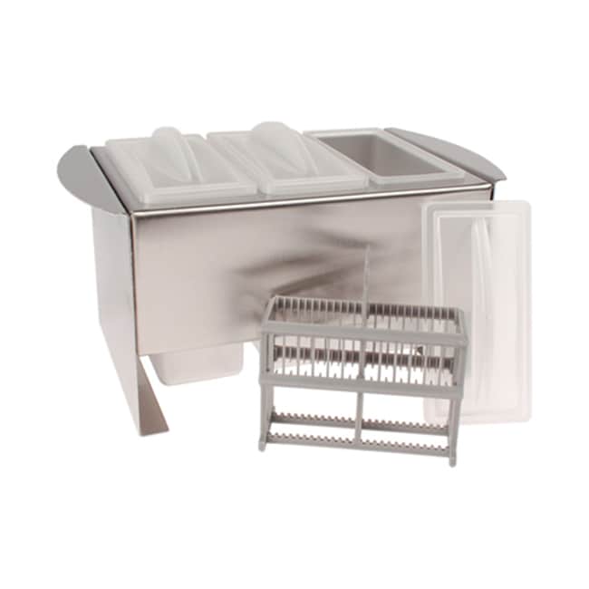 Slide Staining Set includes: (3) Clear Dishes with Lids, (1) Plastic Slide Dipper and (1) three bank stainless steel dish holding rack