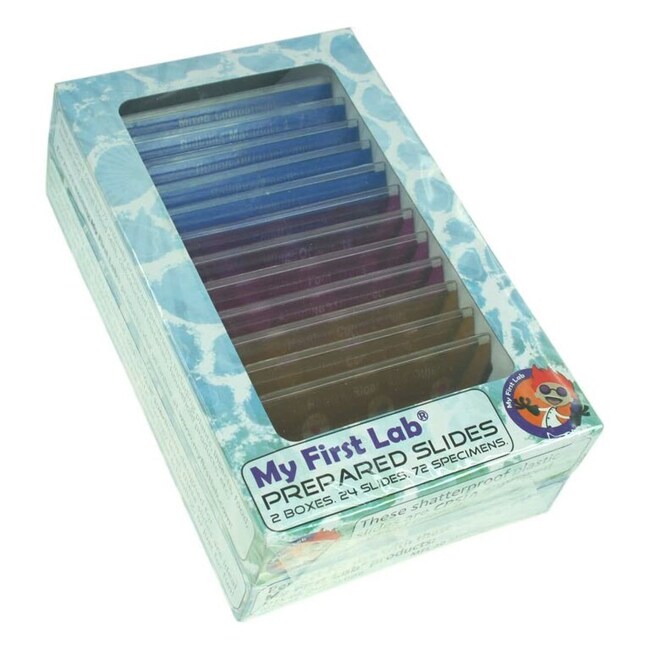 These high quality slides are prepared with unique specimens designed for microscope use. At the beginner to intermediate biology level, these slides are ideal for children up to age 15, and are perfect for classes, home schooling, or just for fun! Contains 72 uniquely prepared specimens, including plants, insects, food, human and animal blood cells, constrction materials, household products, and more. Shatterproof plastic slides. CPSIA approved.