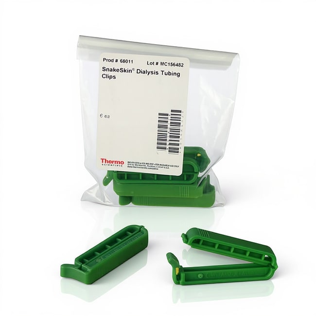 The SnakeSkin 3.5K, 7K, and 10K MWCO dialysis tubing is an easy and ready-to-use traditional dialysis membrane tubing that allows desalting and buffer exchange for samples of 10 to 100 mL. SnakeSkin Dialysis Tubing Clips are sturdy, non-floating tube closures recommended for use with SnakeSkin Dialysis Tubing, but are suitable for any dialysis tubing with flat tube diameters up to 50 mm.