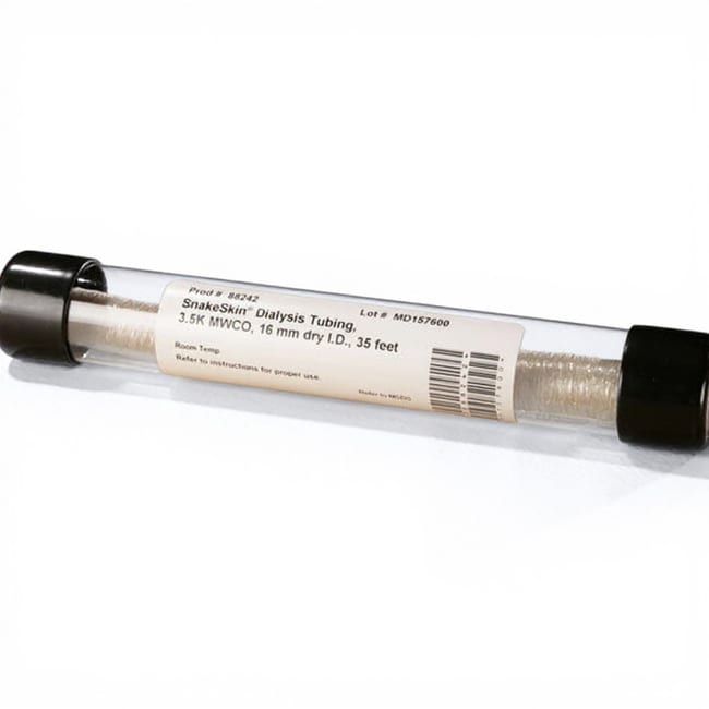 SnakeSkin Dialysis Tubing, 3.5K or 10K MWCO, is composed of regenerated-cellulose and supplied as an open, pleated (telescoped) tube. It is supplied in 20-cm sticks containing 35 feet of dialysis tubing having a 16-, 22-, or 35-mm circular internal diameter (I.D.). With similar capacity to 10.5 meters of 23–50 mm diameter dry flat width tubing, the hydrated SnakeSkin Dialysis Tubing holds ∼2–10 mL of sample per centimeter of length.