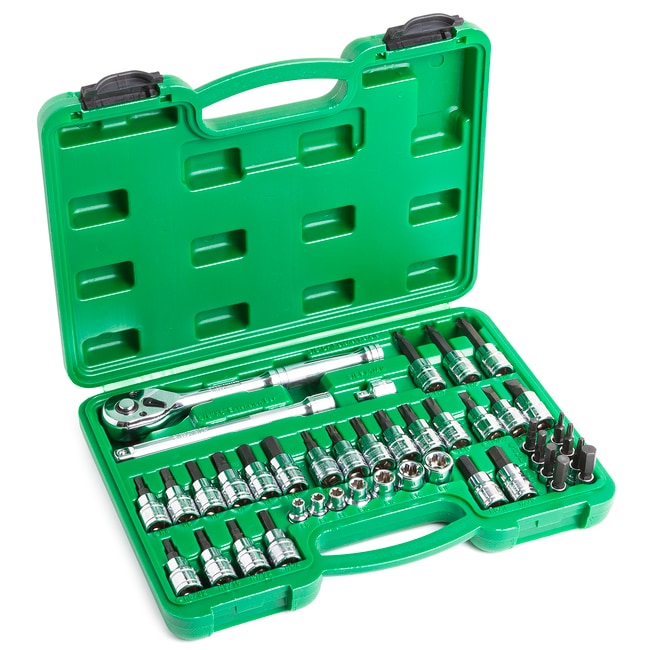 This Steel Vision Tools bit and socket set is perfect for any job around the house, garage, or office. Tackle any plumbing problems, household fixes, or automotive repairs. The polished sockets, high strength bits, and professional grade ratchet will make any job you come across simple and easy.Includes:1/4" Drive (5) Standard hex bit sockets: 3/16", 7/32", 1/4", 5/16", 3/8"(3) Torx; bit sockets: T-15, T-20, T-25 (3) External Torx; sockets: E6, E7, E8 3/8" Drive(6) Standard hex bit sockets: 5/32", 3/16", 7/32", 1/4", 5/16", 3/8" (6) Metric hex bit sockets: 4, 5, 6, 7, 8, 10mm(3) Slotted screwdriver bit sockets: 7/32", 9/32", 3/8" (3) Phillips screwdriver bit sockets: #1, #2, #3(6) Torx; bit sockets: T-27, T-30, T-40, T-45, T-47, T-50 (4) External Torx; sockets: E10, E12, E14, E16(1) Quick release ratchet. (1) 6" extension bar.(1) 1/4" adapter.Comes in a blow mold case.