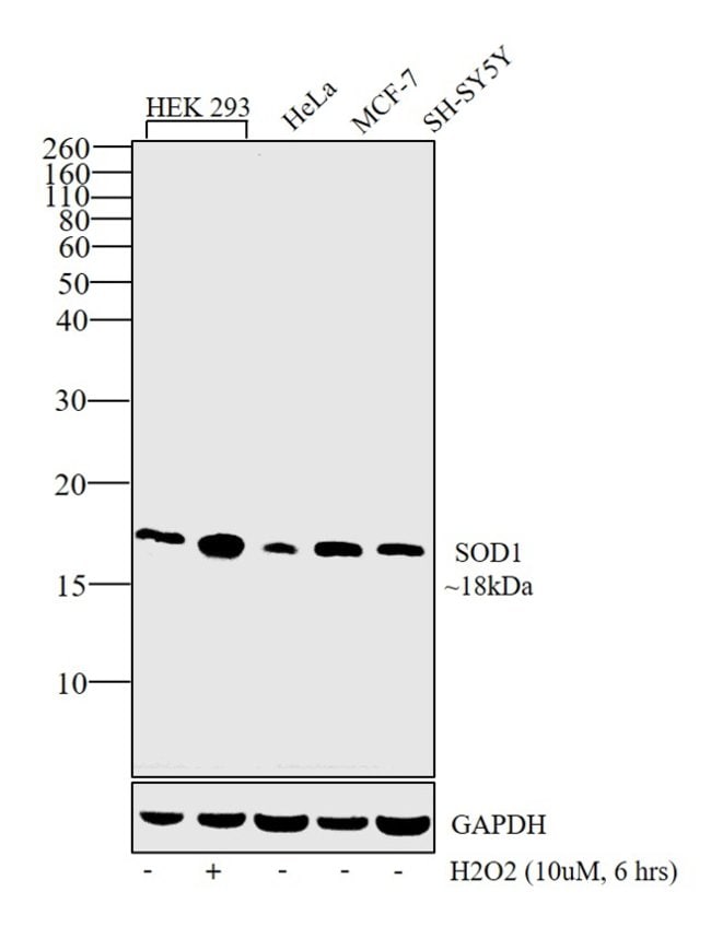 SOD1 (superoxide dismutase) binds copper and zinc ions and is one of two isozymes responsible for destroying free superoxide radicals in the body. This isozyme is a soluble cytoplasmic protein, acting as a homodimer to convert naturally-occuring but harmful superoxide radicals to molecular oxygen and hydrogen peroxide. The other isozyme is a mitochondrial protein. Mutations in this gene have been implicated as causes of familial amyotrophic lateral sclerosis. Rare transcript variants have been reported for this gene.