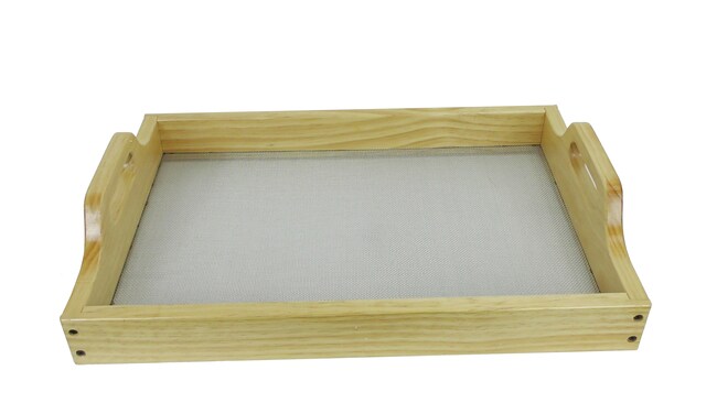 For small items, a sifter with very small openings may be required. This sifter has openings of 2 mm (2,000 microns), which is equivalent to US mesh 10. Large clogs of dirt should be broken up into smaller pieces before sifting. The built-in wooden handles provide an easy grip for one person to shake while sifting. The large durable wooden frame is 24 x 16 x 3 in. (61 x 40.6 x 7.6 cm).