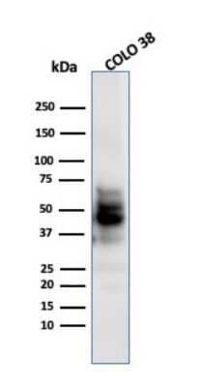| Recognizes a protein of ∼55kDa, identified as SOX10. This MAb is highly specific and does not cross-react with other members of the SOX-family. SOX genes comprise a family of genes that are related to the mammalian sex-determining gene SRY. These genes similarly contain sequences that encode for the HMG-box domain, which is responsible for the sequence-specific DNA-binding activity. SOX-10 is a sensitive marker of melanoma, including conventional, spindled, and desmoplastic subtypes. It is expressed by metastatic melanomas and nodal capsular nevus in sentinel lymph nodes, but not by other lymph node components such as dendritic cells, which usually express S100 protein. Commonly used melanoma markers, such as anti-HMB-45 and anti-Melan-A, are poorly expressed in desmoplastic melanomas while SOX-10 is moderately to strongly expressed in desmoplastic melanomas. SOX-10 is considered as a very reliable marker for recognizing residual desmoplastic melanomas. In normal tissues, it is expressed in Schwann cells, melanocytes, and myoepithelial cells of salivary, bronchial and mammary glands. SOX-10 expression is also observed in mast cells. |