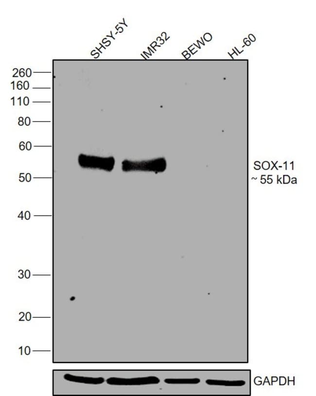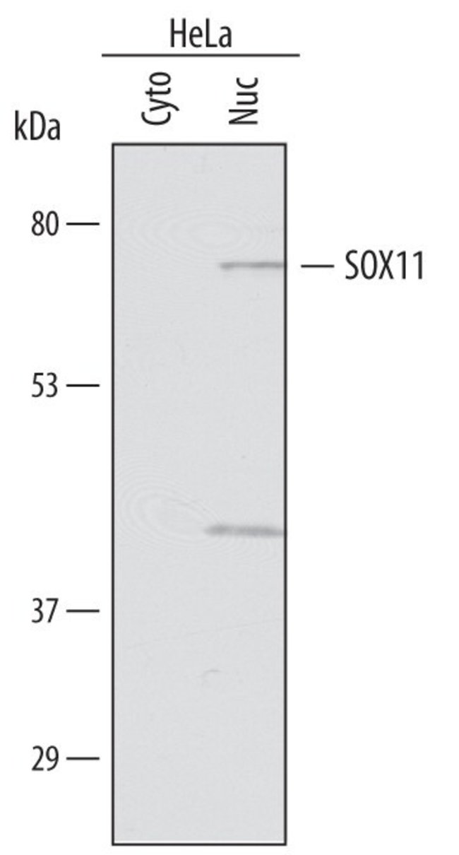 In direct ELISAs, less than 5% cross-reactivity with recombinant human (rh) SOX1, rhSOX2, rhSOX3, rhSOX5, rhSOX6, rhSOX7, rhSOX9, rhSOX10, rhSOX12, rhSOX14, rhSOX15, rhSOX17, and rhSOX21 is observed. Reconstitute at 0.2 mg/mL in sterile PBS.