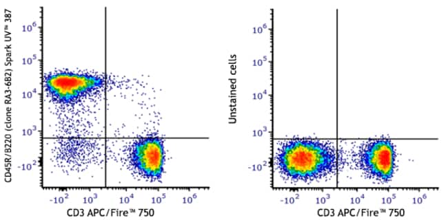 Spark UV™ 387 anti-mouse/human CD45R/B220 [RA3-6B2]; Isotype: Rat IgG2a, κ; Reactivity: Mouse, Human; Apps: FC; Size: 25 μg