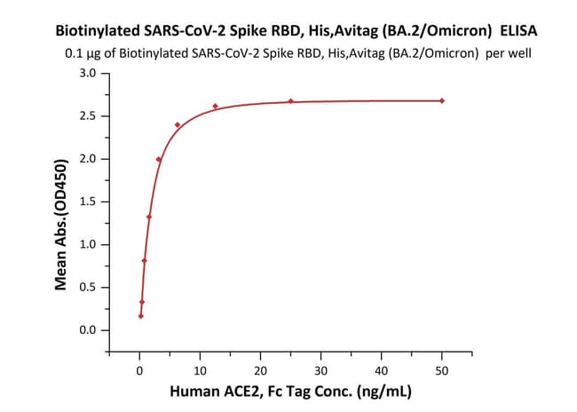 ACROBiosystems Biotinylated SARS-CoV-2 Spike RBD, His,Avitag (BA.2/Omicron) (SPD-C82Eq) is expressed from human 293 cells (HEK293). It contains AA Arg 319 - Lys 537 (Accession # QHD43416.1