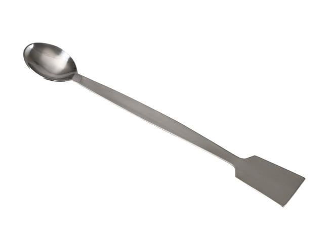 The spatula-spoon can be used in many different applications. The double-sided multi-purpose spoon is a spoon on one side and a spatula on the other. This makes it possible to sample and process a variety of media such as powders, granulates, pastes and liquids. The spoon side of the spoon-spatula holds 4 ml (0.14 oz.) or 11 ml (0.37 oz.) respectively.
