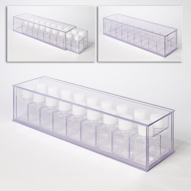 - Holds square media bottles.