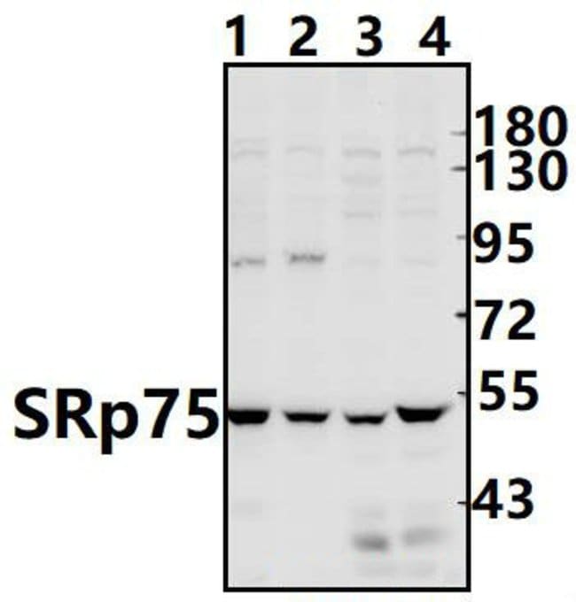 Serine/arginine-rich protein 75 (SRp75) is encoded by the SRSF4 gene. SRp75 belongs to the arginine/serine-rich factor family and likely plays a role in alternative mRNA splicing.The family of SR factors all contain one or more RNA recognition motifs (RRM) and an arginine/ serine (RS)-rich domain. They are not only essential for constitutive splicing but also regulate splicing in a concentration-dependent manner by influencing the selection of alternative splice sites. The majority of SR proteins, including SC35 and SRp40, are confined to the nucleus, while SF2/ASF, SRp20, and 9G8 are continuously shuttled between the nucleus and the cytoplasm and contribute to mRNA transport. The activity of SR proteins in regulated splicing is antagonized by members of the hnRNP A/B family of proteins, which induce drastic shifts in the selection of splicing sites.