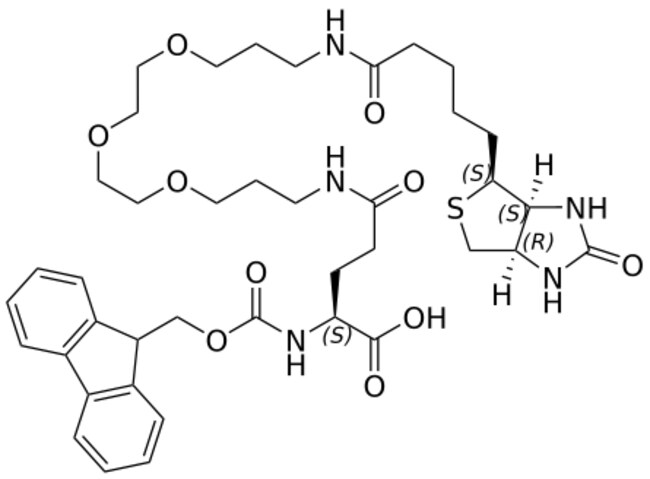- SMILES: [H][C@]12CS[C@H]([C@]1(NC(N2)=O)[H])CCCCC(NCCCOCCOCCOCCCNC(CC[C@@H](C(O)=O)NC(OCC3C4=C(C5=C3C=CC=C5)C=CC=C4)=O)=O)=O