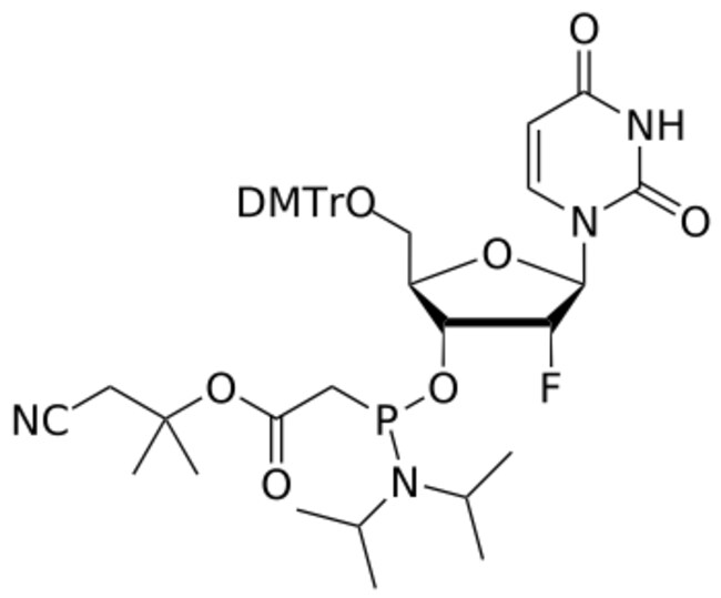 - IUPAC: 1-cyano-2-methylpropan-2-yl 2-((((2R,3R,4R,5R)-2-((bis(4-methoxyphenyl)(phenyl)methoxy)methyl)-5-(2,4-dioxo-3,4-dihydropyrimidin-1(2H)-yl)-4-fluorotetrahydrofuran-3-yl)oxy)(diisopropylamino)phosphaneyl)acetate