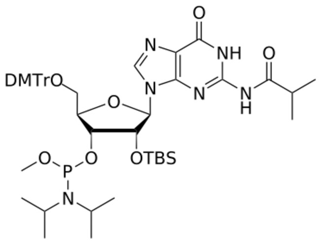 - SMILES: COP(O[C@H]1[C@H]([C@H](N2C(N=C(N3)NC(C(C)C)=O)=C(N=C2)C3=O)O[C@@H]1COC(C4=CC=C(C=C4)OC)(C5=CC=C(C=C5)OC)C6=CC=CC=C6)O[Si](C)(C(C)(C)C)C)N(C(C)C)C(C)C