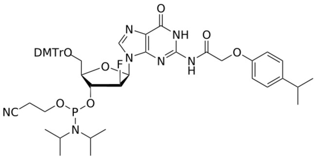 - SMILES: COC1=CC=C(C=C1)C(OC[C@@H]2[C@H]([C@@H]([C@@H](O2)N3C=NC4=C3N=C(NC4=O)NC(COC5=CC=C(C=C5)C(C)C)=O)F)OP(OCCC#N)N(C(C)C)C(C)C)(C6=CC=C(C=C6)OC)C7=CC=CC=C7