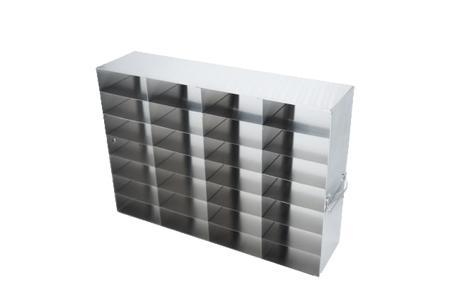 Constructed of corrosion resistant stainless steel Racks fit standard 2" cardboard, plastic, or metal boxes Security lock devices available for each rack 4 Long x 7 Tall= Holds 28 Boxes Freezer Storage Racks are constructed of high-quality, corrosion resistant stainless steel. Handles at both ends accommodate freezers with right or left-handed doors. Our freezer racks have been configured to fit all major ultra-low (-80°) freezers on the market; racks are designed for ultra-low upright freezers. Dimensions (DxHxW): 22 3/16 x 15 3/8 x 5 1/2 inches (429 x 391 x 140mm)Compartment Dimensions(DxHxW): 5 3/8 x 2 3/16 x 5 7/16 inches (136 x 55 x 138mm)