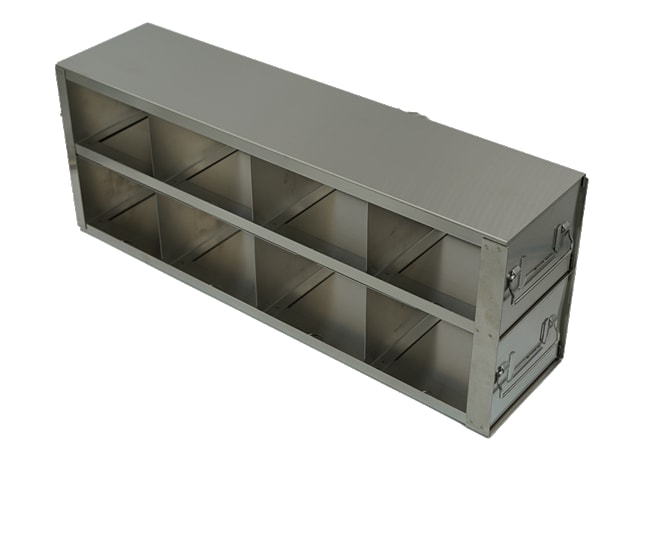 For 3.75″ High Standard BoxesCapacity Box – 4 x 2 = 8 Standard upright freezer racks for storage of 3.75-inch boxes, features 4 boxes deep by 2 boxes high configuration for a total storage of 8 boxes per rack. These upright freezer racks are built with durable, corrosion resistant stainless steel. Each rack includes handles for easy retrieval from a laboratory freezer. This freezer rack does not come standard with storage boxes. Dimensions L x H x W: 22 1/8 x 8 1/16 x 5 1/2 inch (562 x 205 x 140mm)Compartment Size L x H x W: 5 3/8 x 3 15/16 x 5 3/8 inch (136 x 100 x137mm)