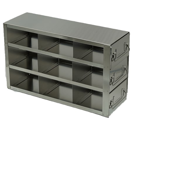 Constructed of corrosion resistant stainless steel Racks fit standard 3" cardboard, plastic, or metal boxes Security lock devices available for each rack Freezer Storage Racks are constructed of high-quality, corrosion resistant stainless steel. Handles at both ends accommodate freezers with right or left-hand doors. Our freezer racks have been configured to fit all major ultra-low (-80°) freezers on the market; racks are designed for ultra-low upright freezers. Upright Freezer Drawer racks offer a more organized system for storage and retrieval of samples. Drawer racks facilitate both access to and storage of samples without having to remove the whole rack from the freezer. Dimensions (DxWxH): 16 3/4 x 5 1/2 x 10 1/16 inches (426 x 140 x 256mm)Compartment Dimensions: 5 3/8 x 5 1/4 x 3 inches (133 x 137.4 x 75.9mm)
