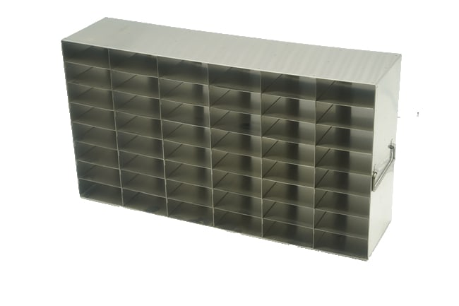 For 25- Place Slide Boxes The UFS-25-68 standard upright freezer racks for storage of 25-place slide boxes, features 6 boxes deep by 8 boxes high configuration for a total storage of 48 boxes per rack. These upright freezer racks are built with durable, corrosion resistant stainless steel. Each rack includes handles for easy retrieval from a laboratory freezer. This freezer rack does not come standard with 25-place slide boxes. Dimensions (DxWxH): 22 11/16 x 5 11/16 x 12 1/4 inches (576.5 x 145 x 310.5mm)Compartment Dimensions: 3 5/8 x 5 5/8 x 1 1/2 inches (92 x 143 x 38mm)