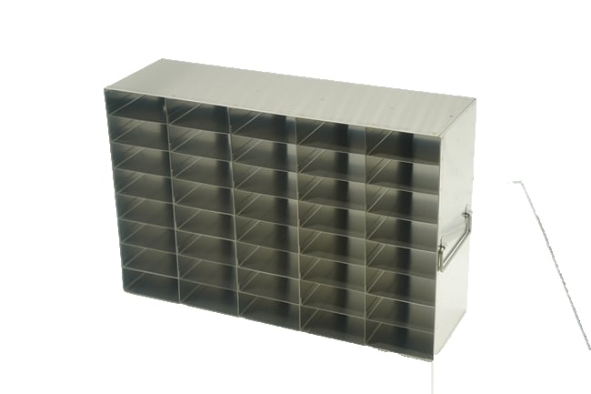 For 25- Place Slide Boxes The UFS-25-58 standard upright freezer racks for storage of 25-place slide boxes, features 5 boxes deep by 8 boxes high configuration for a total storage of 40 boxes per rack. These upright freezer racks are built with durable, corrosion resistant stainless steel. Each rack includes handles for easy retrieval from a laboratory freezer. This freezer rack does not come standard with 25-place slide boxes. Dimensions (DxWxH): 19 x 5 11/16 x 12 1/4 inches (483 x 145 x 310.5mm)Compartment Dimensions: 3 5/8 x 5 5/8 x 1 1/2 inches (92 x 143 x 38mm)