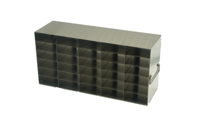 For 25- Place Slide Boxes The UFS-25-56 standard upright freezer racks for storage of 25-place slide boxes, features 5 boxes deep by 6 boxes high configuration for a total storage of 30 boxes per rack. These upright freezer racks are built with durable, corrosion resistant stainless steel. Each rack includes handles for easy retrieval from a laboratory freezer. This freezer rack does not come standard with 25-place slide boxes. Dimensions (DxWxH): 19 x 5 11/16 x 9 3/16 inches (483 x 145 x 233.5mm)Compartment Dimensions: 3 5/8 x 5 5/8 x 1 1/2 inches (92 x 143 x 38mm)