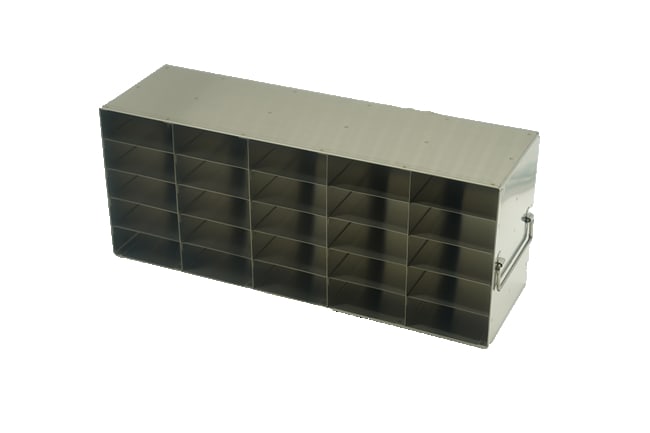 For 25- Place Slide Boxes The UFS-25-55 standard upright freezer racks for storage of 25-place slide boxes, features 5 boxes deep by 5 boxes high configuration for a total storage of 25 boxes per rack. These upright freezer racks are built with durable, corrosion resistant stainless steel. Each rack includes handles for easy retrieval from a laboratory freezer. This freezer rack does not come standard with 25-place slide boxes. Dimensions (DxWxH): 19 x 5 11/16 x 7 11/16 inches (483 x 145 x 195mm)Compartment Dimensions: 3 5/8 x 5 5/8 x 1 1/2 inches (92 x 143 x 38mm