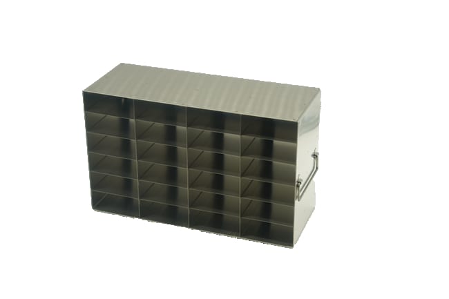 For 25- Place Slide Boxes The UFS-25-46 standard upright freezer racks for storage of 25-place slide boxes, features 4 boxes deep by 5 boxes high configuration for a total storage of 20 boxes per rack. These upright freezer racks are built with durable, corrosion resistant stainless steel. Each rack includes handles for easy retrieval from a laboratory freezer. This freezer rack does not come standard with 25-place slide boxes. Dimensions (DxWxH): 15 5/16 x 5 11/16 x 9 3/16 inches (389 x 145 x 233.5mm)Compartment Dimensions: 3 5/8 x 5 5/8 x 1 1/2 inches (92 x 143 x 38mm)