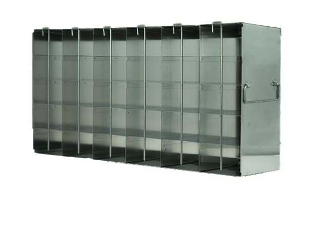 For 96-Well Microtube BoxesFor Speciality Tube Racks (Matrix, Abgene, Fluidx, Micronic)- H: 5/8″- 2 1/8″ (17.3-53.5mm)Our Freezer Storage Racks are constructed of high-quality, corrosion resistant stainless steel. Durable stainless steel freezer racks facilitate organization and maximize valuable storage space.. Handles at both ends accommodate freezers with right or left handed doors. Racks are for 96-Well Microtube Boxes. Each rack compartment holds a single 96-Well Microtube Box. Includes locking rod. Our freezer racks have been configured to fit all major ultra low (-80°) freezers on the market; racks are designed for ultra low upright freezers. Dimensions (DxWxH): 22 1/2 x 5 1/2 x 11 3/16 inches (571 x 140 x 284mm)Compartment Dimensions: 3 9/16 x 2 3/16 x 5 3/16inch (91 x 55 x 130.7mm)